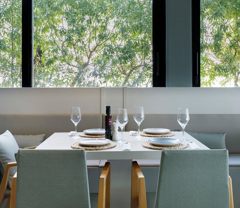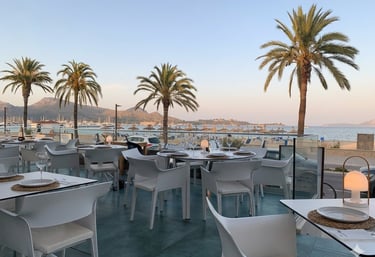 Disfruta de una terraza elegante en Port de Pollença con vistas a la bahía, brisa marina y un entorno perfecto para comidas, cenas, celebraciones y momentos especiales en Mallorca.